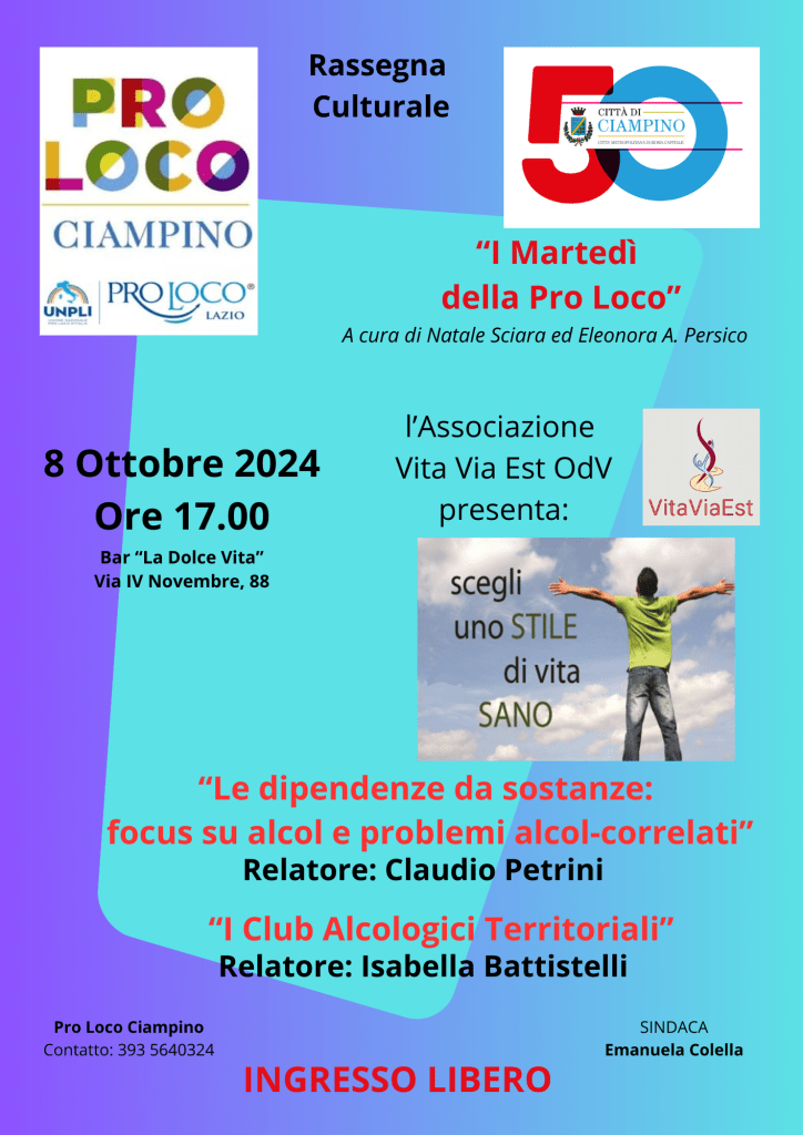 Informare sulle conseguenze dovute alle dipendenze, in special modo l’alcol, è utile ed importante. Grazie ad Eleonora A. Persico e alla Pro Loco Ciampino abbiamo organizzato questo incontro informativo. Vi aspettiamo al Bar La Dolce Vita di via IV Novembre, 88 a Ciampino, martedì 8 Ottobre alle 17.00