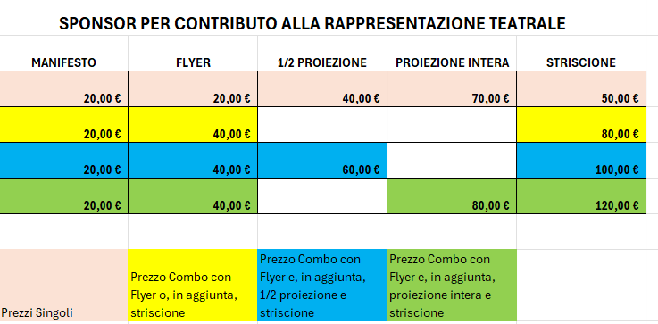 Se vuoi sostenere, come commerciante, con un piccolo contributo/sponsor, saranno previste pubblicità su: manifesto di ringraziamento (all’ingresso e all’interno del locale), flyer di presentazione della rappresentazione e dell’associazione (distribuito ai ragazzi delle scuole la mattina e ai partecipanti della sera), proiezione su schermo prima della rappresentazione (mezza o intera), con la possibilità di inserire striscioni all’interno dell’auditorium. Di seguito i contributi minimi: