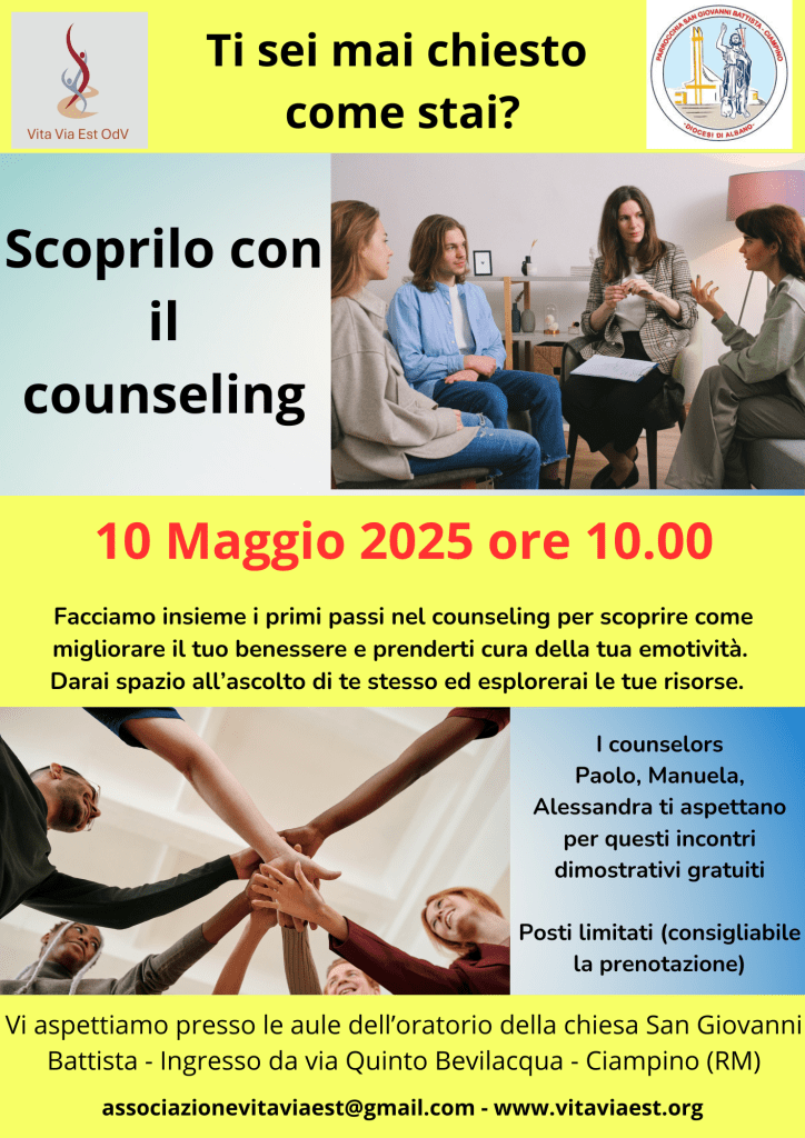 Il primo incontro sul counseling ha riscontrato un successo inaspettato: le persone che si sono presentate sono rimaste entusiaste da come ci si possa sentire quando ci si ferma un po’ ad ascoltare la propria mente e il proprio corpo. Spesso la vita, ormai diventata troppo frenetica, ci ha fatto dimenticare come si può stare bene anche solo in compagnia di noi stessi, senza apparecchiature elettroniche e cercando di capire i segnali che il corpo ti sta mandando.