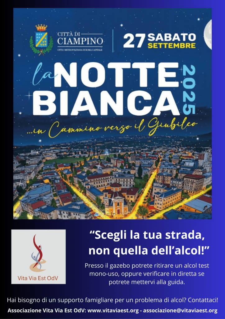Vi aspettiamo alla Notte Bianca di Ciampino, sabato 27 Settembre per le vie centrali della città, al nostro gazebo in collaborazione con la Pro Loco e l’autoscuola Viola, per informarvi sulla pericolosità di assunzione di qualsiasi quantità di alcol alla guida. Avrete la possibilità di effettuare un alcol test su base volontaria, di prenderne uno da tenere di scorta in auto per ogni evenienza, e di prendere il materiale informativo messo a disposizione dall’Istituto Superiore di Sanità. Scegli uno stile di vita sano.